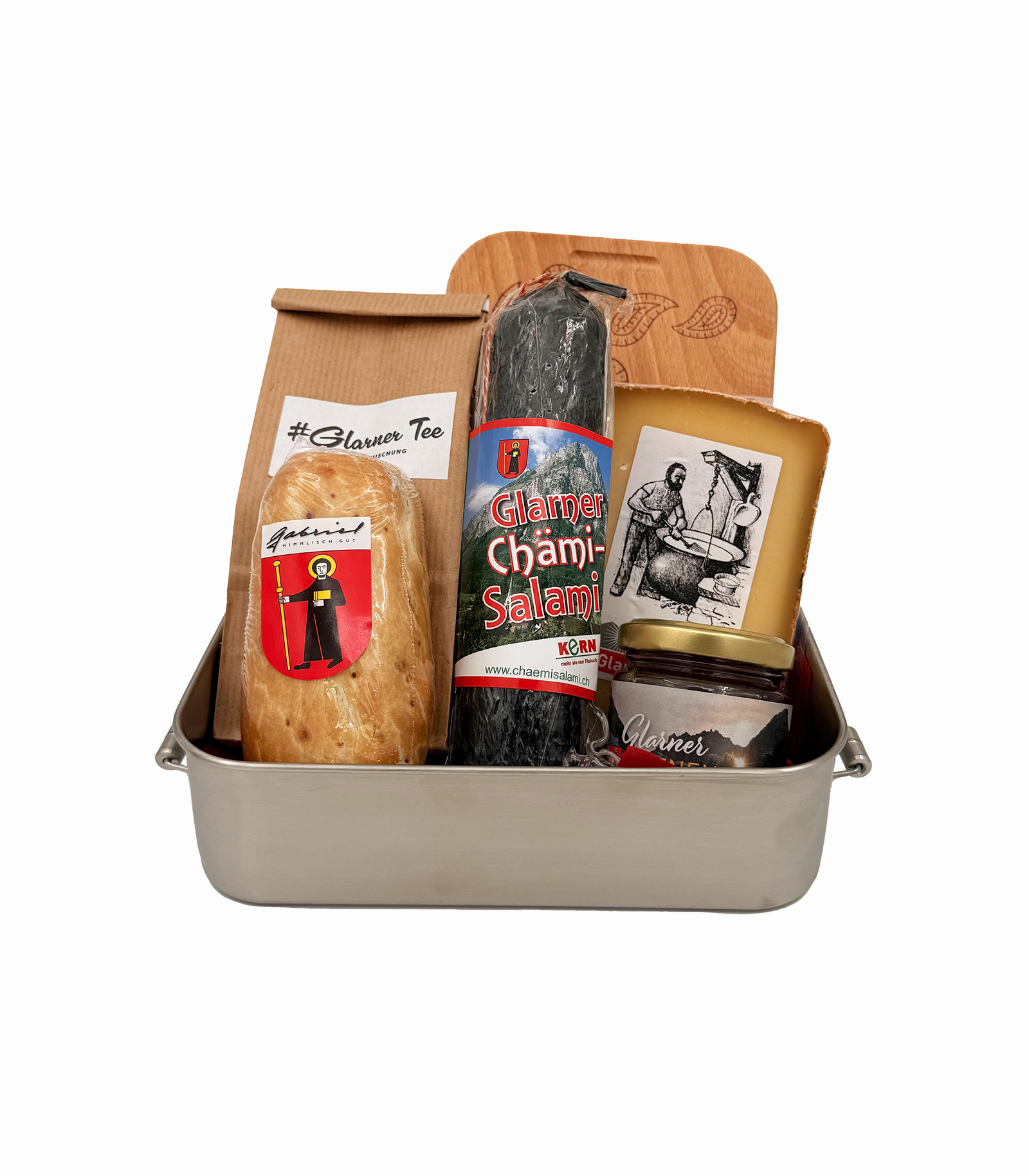 Inhalt: Lunchbox aus Edelstahl mit Paisley-Holzbrett als Deckel, Glarner Alpkäse, Glarner Bienenhonig (250g), Glarner Chämi-Salami, Glarner Tee, kleines Birnbrot